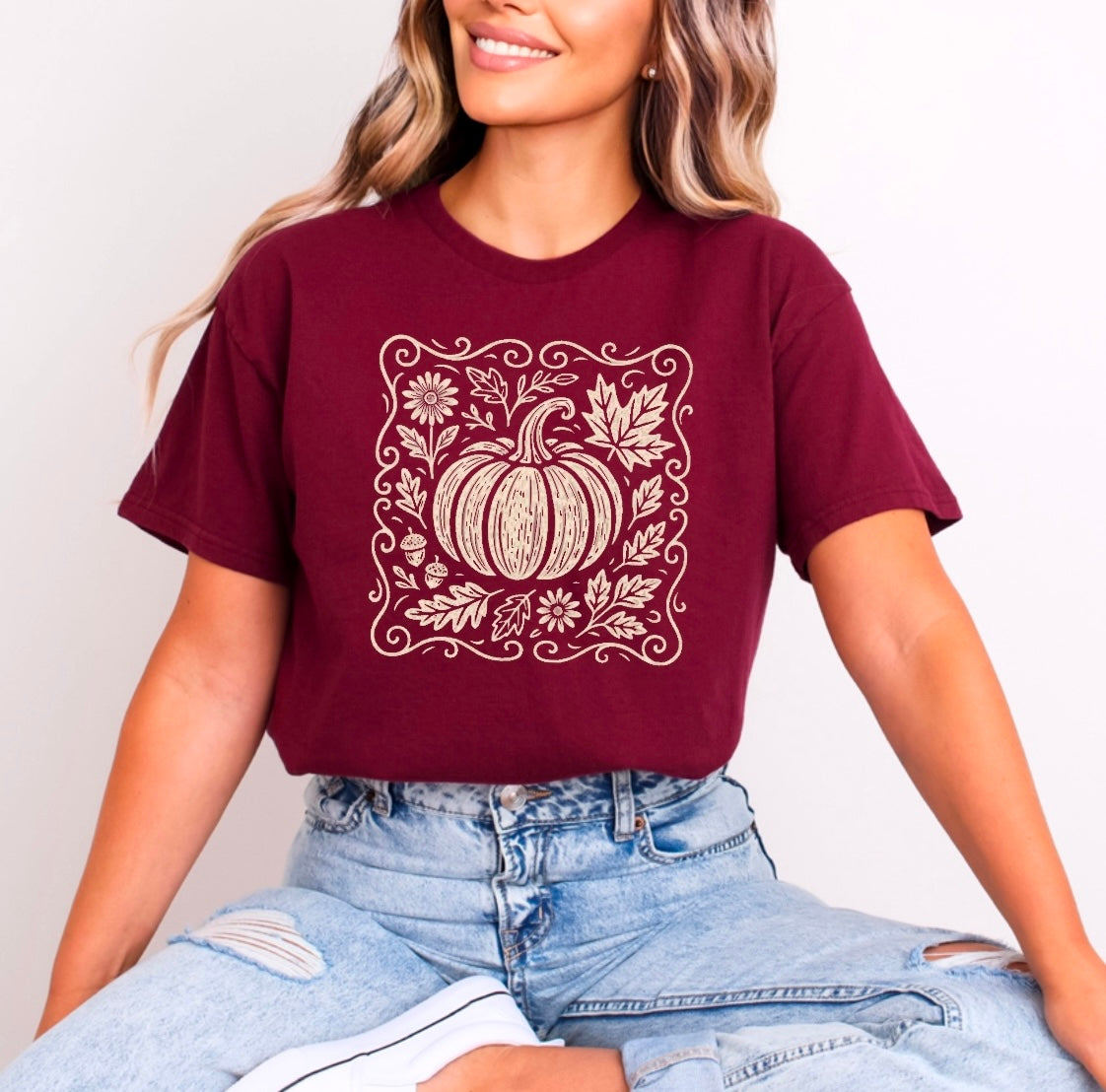 No restocks. Preorder. This listing is for 1 maroon fall pumpkin crewneck t-shirt.