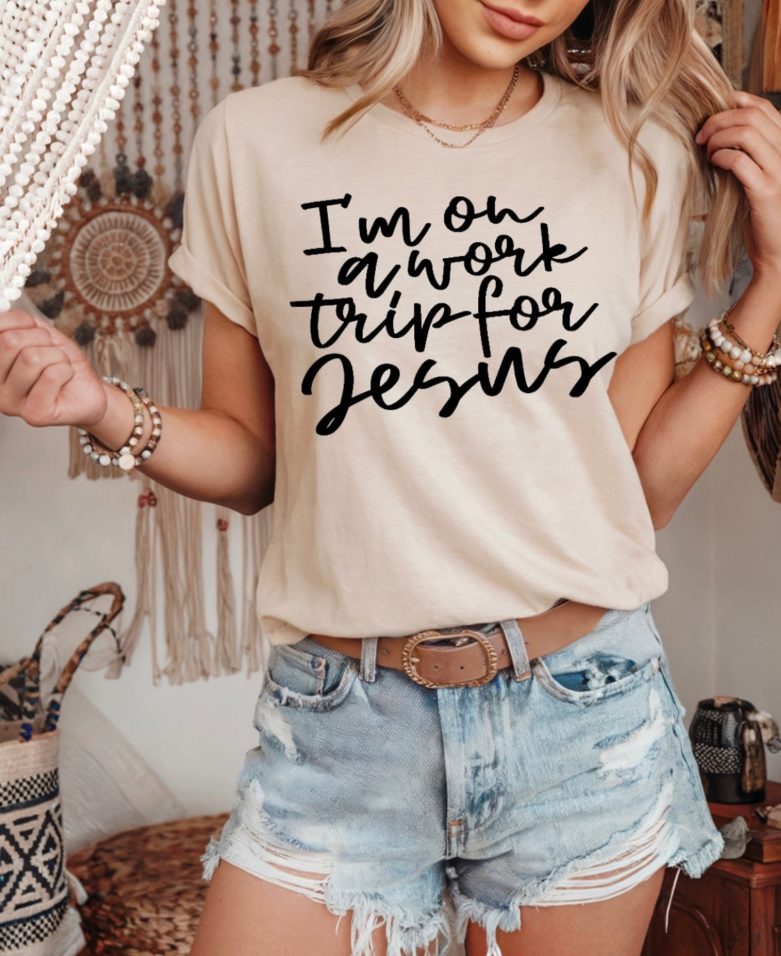 This listing is for 1 natural I’m on a work trip for Jesus crewneck t-shirt.